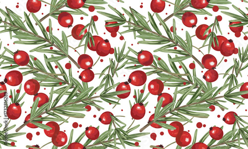 Obraz premium hand drawn seamless christmas pattern with rosemary branches and red berries...