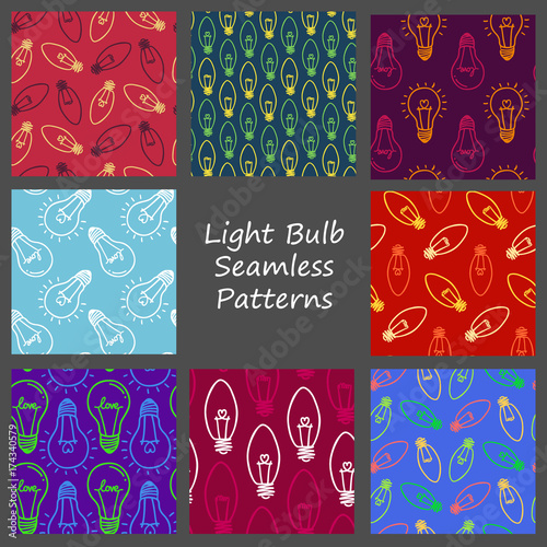 Fototapeta premium Hand drawn seamless pattern with light bulb, heart. Light bulb lamp icon.