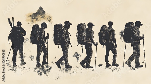 © pkproject, Naklejka premium Hand-Drawn Silhouettes of Hikers with Backpacks Embarking on Outdoor Expedition