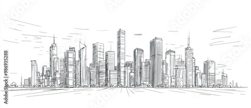 © nurman, Naklejka premium Hand-drawn sketch of a city skyline with tall buildings.