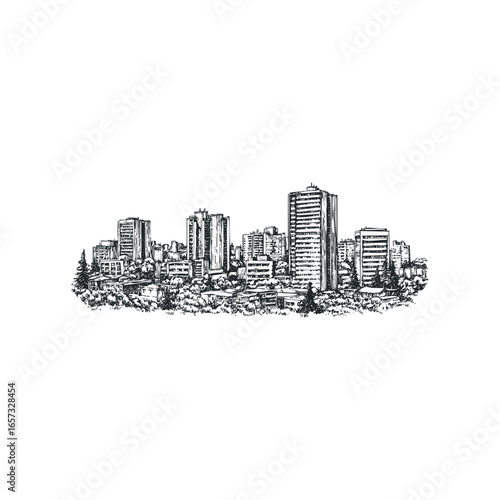 Fototapeta premium Hand-drawn sketch of a dense city skyline with diverse buildings and lush trees