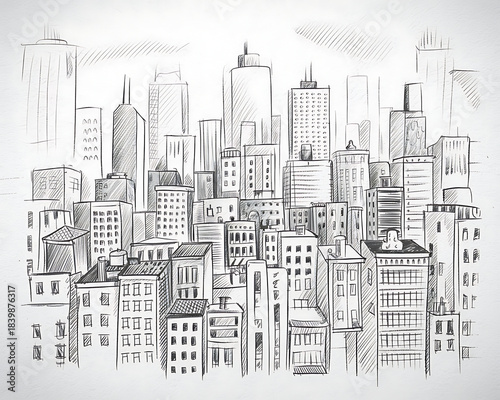 Fototapeta premium Hand Drawn Sketch of a Dense City Skyline with Tall Buildings and Varying Architecture drawing