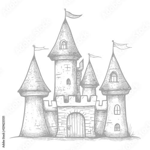 Obraz premium Hand Drawn Sketch Of A Majestic Stone Castle With Flags