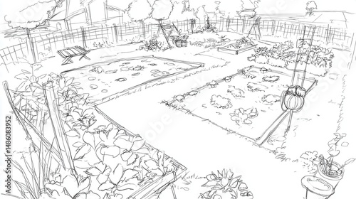 Fototapeta premium Hand-drawn sketch of a meticulously planned garden.