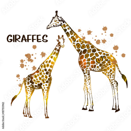 © Ecaterina Sciuchina, Obraz premium Hand drawn sketch set of giraffes. Vector illustration isolated on white background.