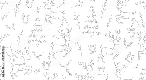 © adiba sakila atmari, Fototapeta premium Hand Drawn Sketchy Christmas Deer and Pine Trees Seamless Pattern.