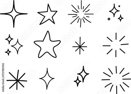 © Hanan, Obraz premium Hand drawn sparkle starburst elements set doodle shine burst icons collection decorative twinkle symbols.