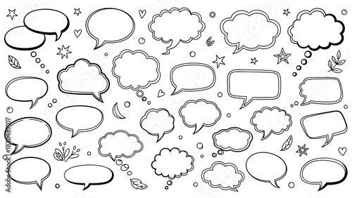 © Ashok, Fototapeta premium Hand drawn speech bubbles collection with stars and doodles in black and white