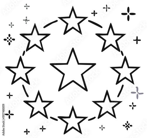Obraz premium Hand-drawn star circle illustration with central star and twinkling sparkle...