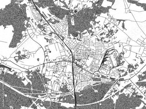 © W&S Stock, Fototapeta premium Hand-drawn style black and white city map of Zawiercie, Poland, with detailed streets and textures.