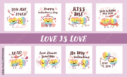Fototapeta premium Hand drawn style rainbow heart shape valentine's day cards with love quote. Collection of the LGBTQ couple lover date. Joyful homosexual couple in love concept set. Kiss Hug Warm XOXO Soulmate Dance