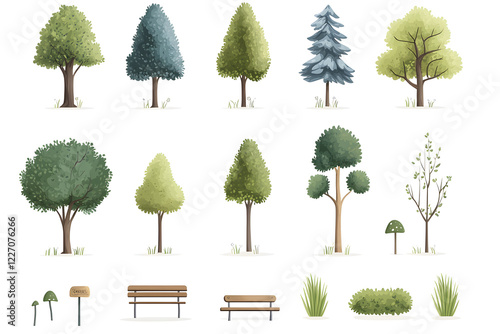 © Oksana_Latysheva, Fototapeta premium Hand drawn trees and bushes collection for game assets, isolated on white background