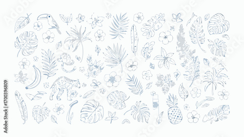 © MihirKumarMondal, Fototapeta premium Hand drawn tropical elements collection with animals and plants