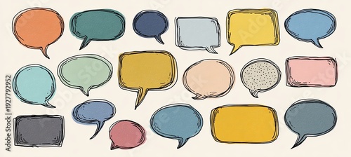 Fototapeta premium Hand-drawn, varied-shape speech bubbles in multiple colors on a cream background