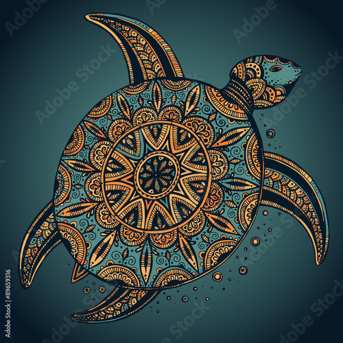 Naklejka premium Hand drawn vector colorful doodle turtle with oriental ornament.