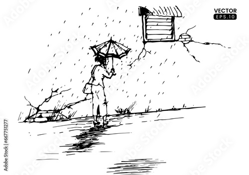 © Antheia.id, Naklejka premium Hand drawn vector illustration. landscape sketch vector formats with woman using umbrella when raining