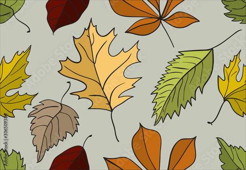 © mitay20, Obraz premium Hand drawn vector seamless pattern with leaf. Decorative template texture with autumn leaf, background