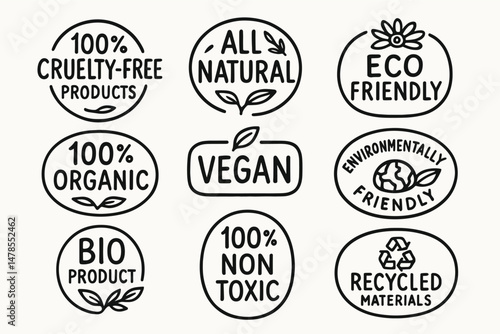 Fototapeta premium Hand drawn vegan, cruelty-free, and eco friendly product label badges set....