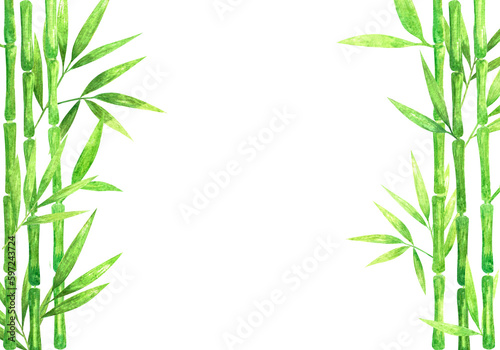 Naklejka premium Hand drawn watercolor bamboo cane green lush foliage tropical leaves one both side mock up with copy space.Isolated on white, web design element for cards, invitations.