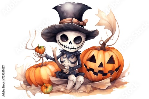 Fototapeta premium Hand drawn watercolor Halloween illustration with skeleton and pumpkins isolated on white background