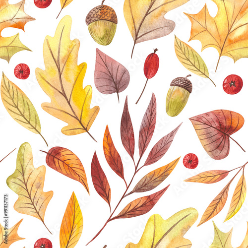 © Myrcot, Fototapeta premium Hand drawn watercolor pattern with autumn leaves. Watercolor
