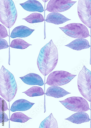 © Aleksandra Shvetsova, Fototapeta premium Hand drawn watercolor purple and blue walnut leaves post card isolated on white background. Can be used for card, label, book cover and other printed products.