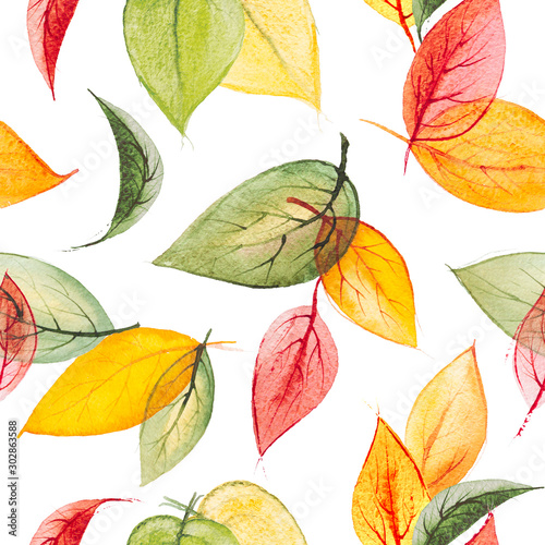 © alchena, Fototapeta premium Hand drawn watercolor seamless pattern with bright orange,yellow,green,red autumn leaves on the white background for your design