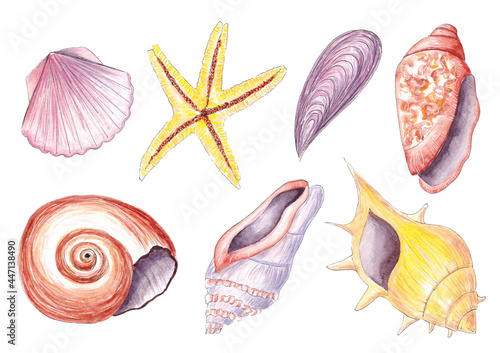 Obraz premium Hand drawn watercolor set with exotic sea shell. Ocean wildlife