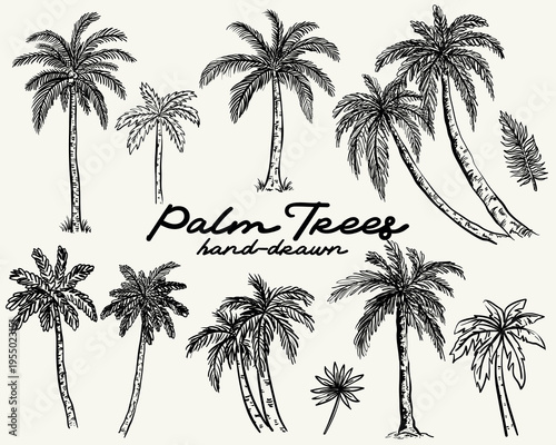 © Wiktoria Matynia, Naklejka premium Hand drawn whimsical style palm trees vector set