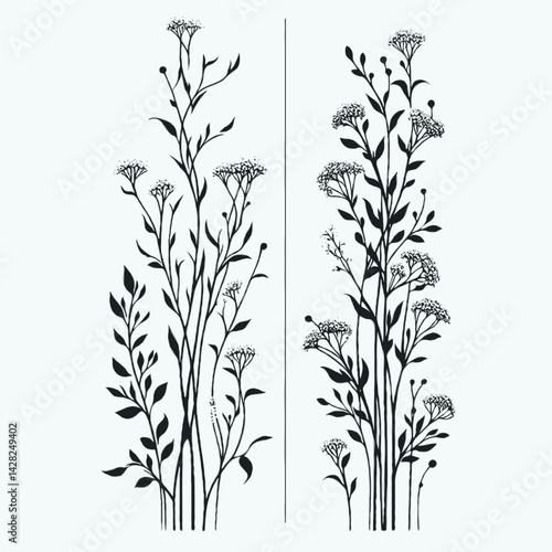 © Armine, Naklejka premium Hand drawn wild flowers Botanical drawing. line art grasses, stems illustration. Black and White Meadow herbs. Herbaceous blooming plants. Set of outline doodle floral sketch Leaves