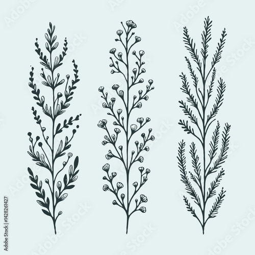 © Armine, Naklejka premium Hand drawn wild flowers Botanical drawing. line art grasses, stems illustration. Black and White Meadow herbs. Herbaceous blooming plants. Set of outline doodle floral sketch Leaves