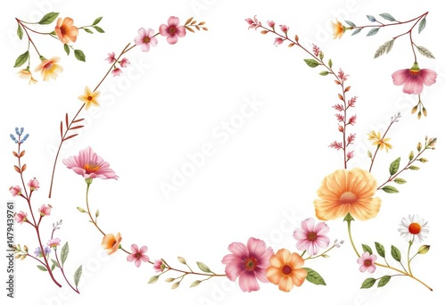 © DITSARAPHAN, Obraz premium Hand-drawn wildflowers & foliage frame wedding invitation template; elegant floral background, romantic, invitation
