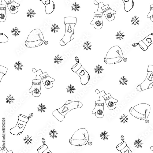 © Marisha paint, Naklejka premium Hand-drawn winter clothing. Seamless pattern. Endless ornament. Vector illustration in doodle style. Merry Christmas and Happy New Year. Black elements on a white background.