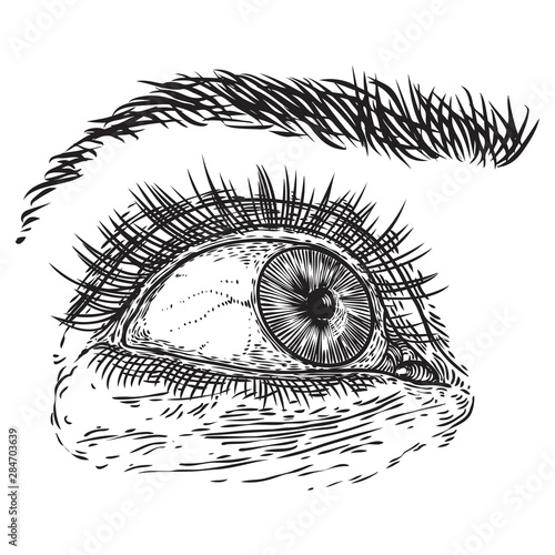 © desertsands, Obraz premium Hand drawn woman eye with iris, eyebrows and full lashes. Makeup salon design element. Vector.