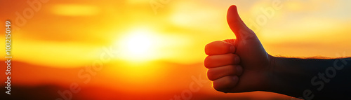 © Anatthaphon, Obraz premium Hand giving thumbs up gesture against beautiful sunset, symbolizing positivity and good vibes.