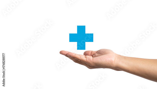 © photostockatinat, Fototapeta premium Hand holding a blue plus sign symbol, indicating healthcare or support