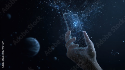 © Tujuh, Fototapeta premium Hand holding a digital phone in space
