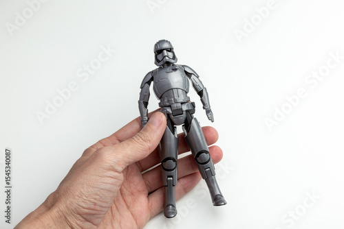 © stasknop, Naklejka premium Hand Holding a Grey Stormtrooper Action Figure