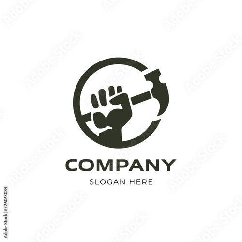 © Yuni25, Obraz premium Hand holding a hammer. home repair service logo vector icon illustration