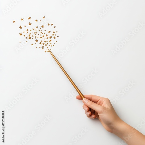 © Kin no Hikari, Fototapeta premium Hand holding a magic wand with sparkling stars on a white background.