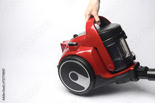 Fototapeta premium Hand holding a modern red vacuum cleaner on a white background