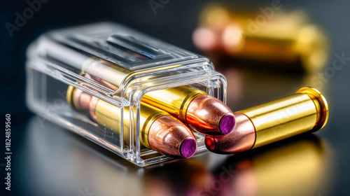 © Aliaksandra, Obraz premium Hand holding a plastic box filled with shiny brass and copper bullets