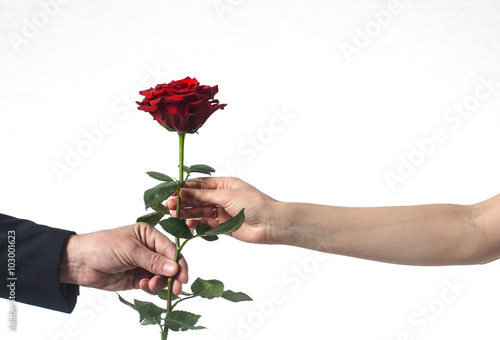 © Elroi, Obraz premium hand holding a single red rose white background