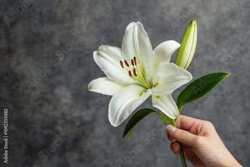 © Maelgoa, Fototapeta premium Hand holding a white lily, on a grey background, soft light, angled view 1