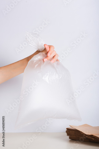 Naklejka premium Hand holding an empty transparent plastic bag and a stack of eco-friendly paper bags on the table