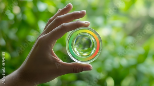 © Muhammad, Fototapeta premium Hand holding colorful glass lens with green leaves background