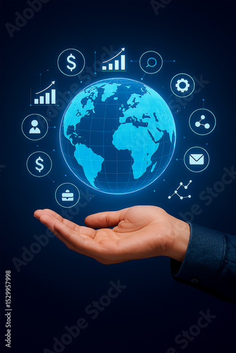 Fototapeta premium Hand Holding Digital Globe – Global Business and Technology Concept on Solid...