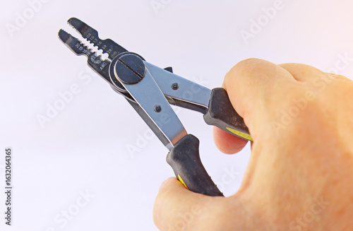 © Larisa, Obraz premium Hand holding electrical tools to assemble the electrical control panel.