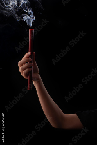 Fototapeta premium Hand holding extinguished red wax candle with beautiful smoke