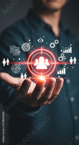 Naklejka premium Hand holding glowing target with people icons and business analytics symbols